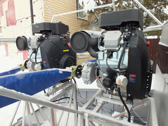 Особенность данной модели – два мотора. На «Нерпу 560-2М» установлены новые бензиновые четырёхтактные двухцилиндровые карбюраторные двигатели с воздушным охлаждением и с электростартером, мощностью 35 л.с. каждый. Общая мощность аэролодки 70 л.с.
