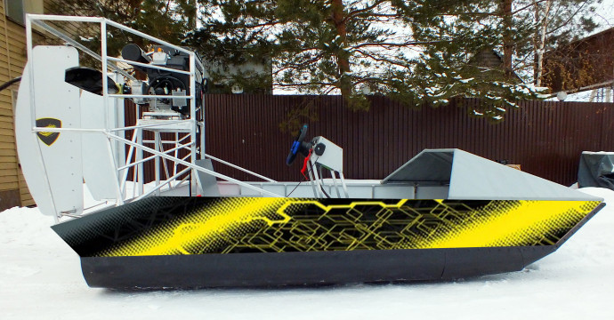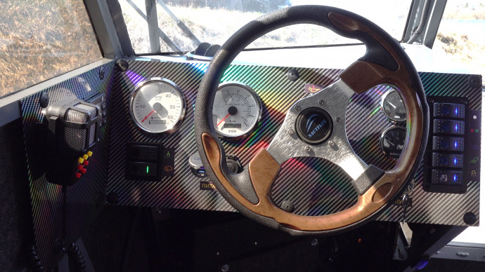 Редуктор ременный. Требует настройки и регулировки. Бензобак ёмкостью 50 л. с бензонасосом и датчиком уровня топлива. Лодка управляется рулём с приводом на воздушные рули. Оснащение рулевой консоли зависит от комплектации. В Люкс версии установлены: тахометр со счётчиком моточасов, указатели температуры двигателя, указатель скорости GPS, давления масла, вольтметр, указатель уровня топлива.