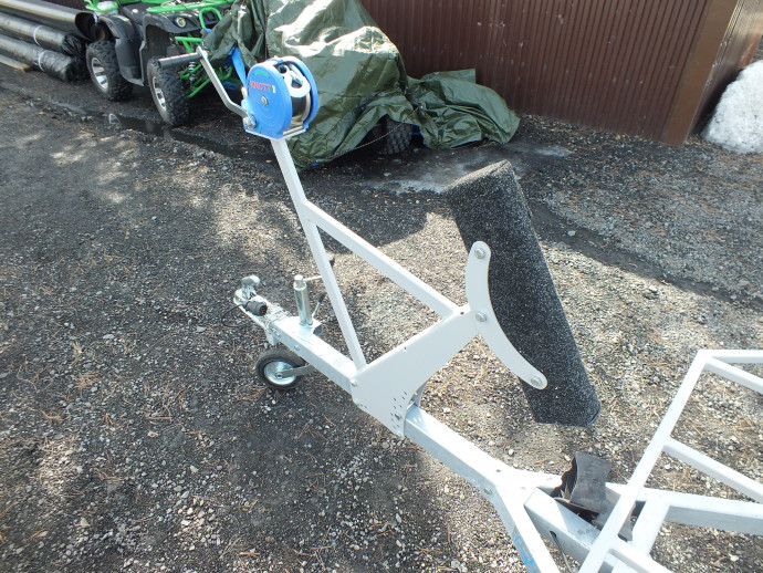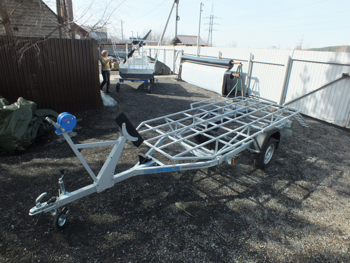 На прицеп установлена ручная лебёдка, которая помогает при разгрузке и погрузке прицепа. Совсем не обязательно загонять прицеп в воду. Это очень важно в межсезонье и зимой. Погрузку и разгрузку можно осуществить с любой поверхности: со снега, льда или земли.