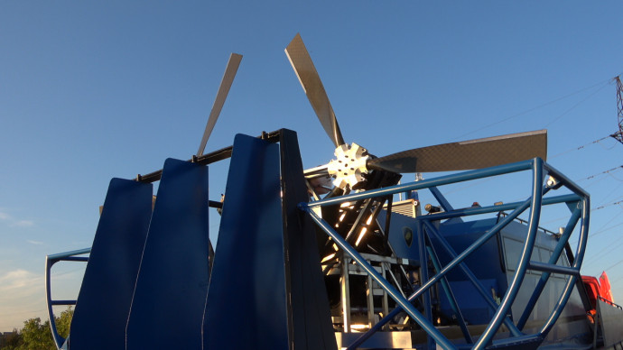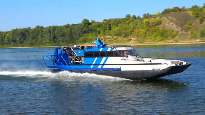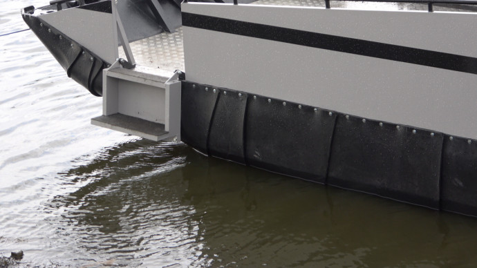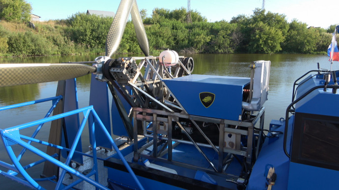 Лодка оборудована трансмиссией с запатентованным ременным V-образным редуктором для оптимального распределения нагрузки. Такое решение обеспечивает безопасность и звукоизоляцию, а также позволяет разместить двигатель внутри корпуса лодки. Он гораздо прочнее цепи, и гораздо надежней. Для создания тяги используется система из двух пропеллеров диаметром 2,5 метра. Такой внушительный размер служит для реализации большого крутящего момента. Здесь пропеллеры крутятся в одну сторону, но в середине у них есть перехлест, что дополнительно дает больший КПД тяги. Это тоже наша запатентованная разработка.