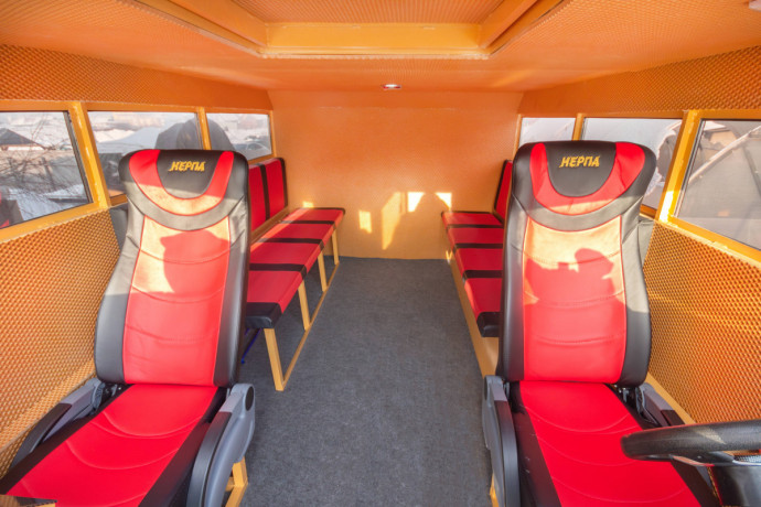 Кабина «Нерпы 1010» комфортная и тёплая, что очень важно особенно для северных регионов. В кабине есть тепло-шумоизоляция, отапливается от тепла двигателя, а также двумя автономными воздушными отопителями. Всего 10 посадочных мест. Кресло водителя и пассажира комфортабельные, имеют подголовник, регулировку положения сиденья и спинки. Для 8 пассажиров вдоль бортов установлены два дивана на 4 места каждый.