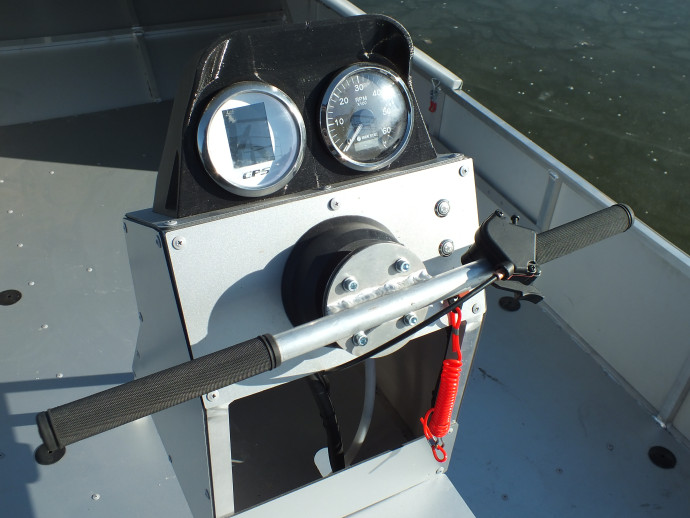 Лодка управляется рулём с приводом на воздушные рули. На рулевой колонке установлены: тахометр со счётчиком моточасов, GPS указатель скорости и аварийная чека.