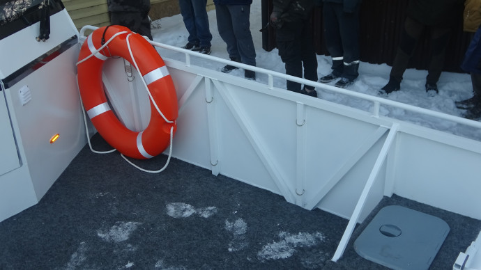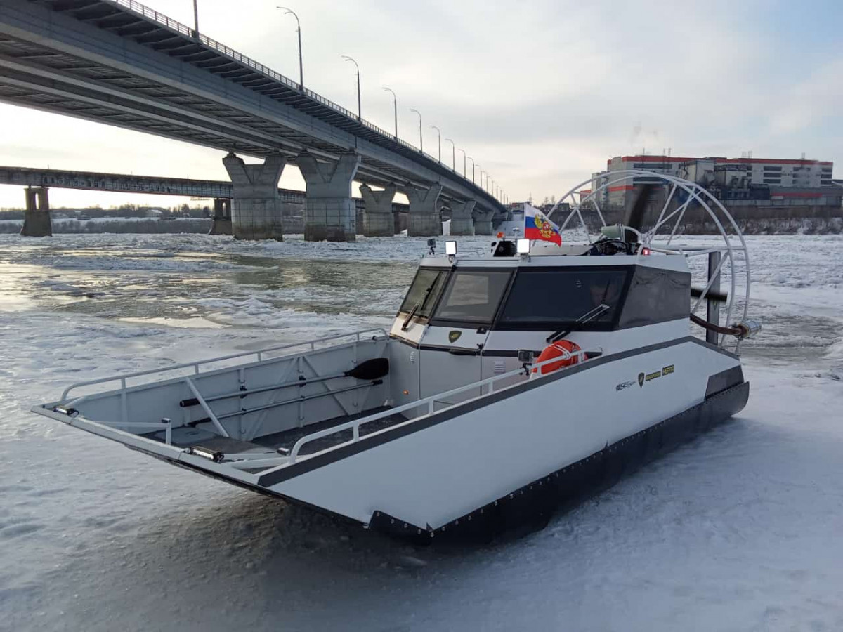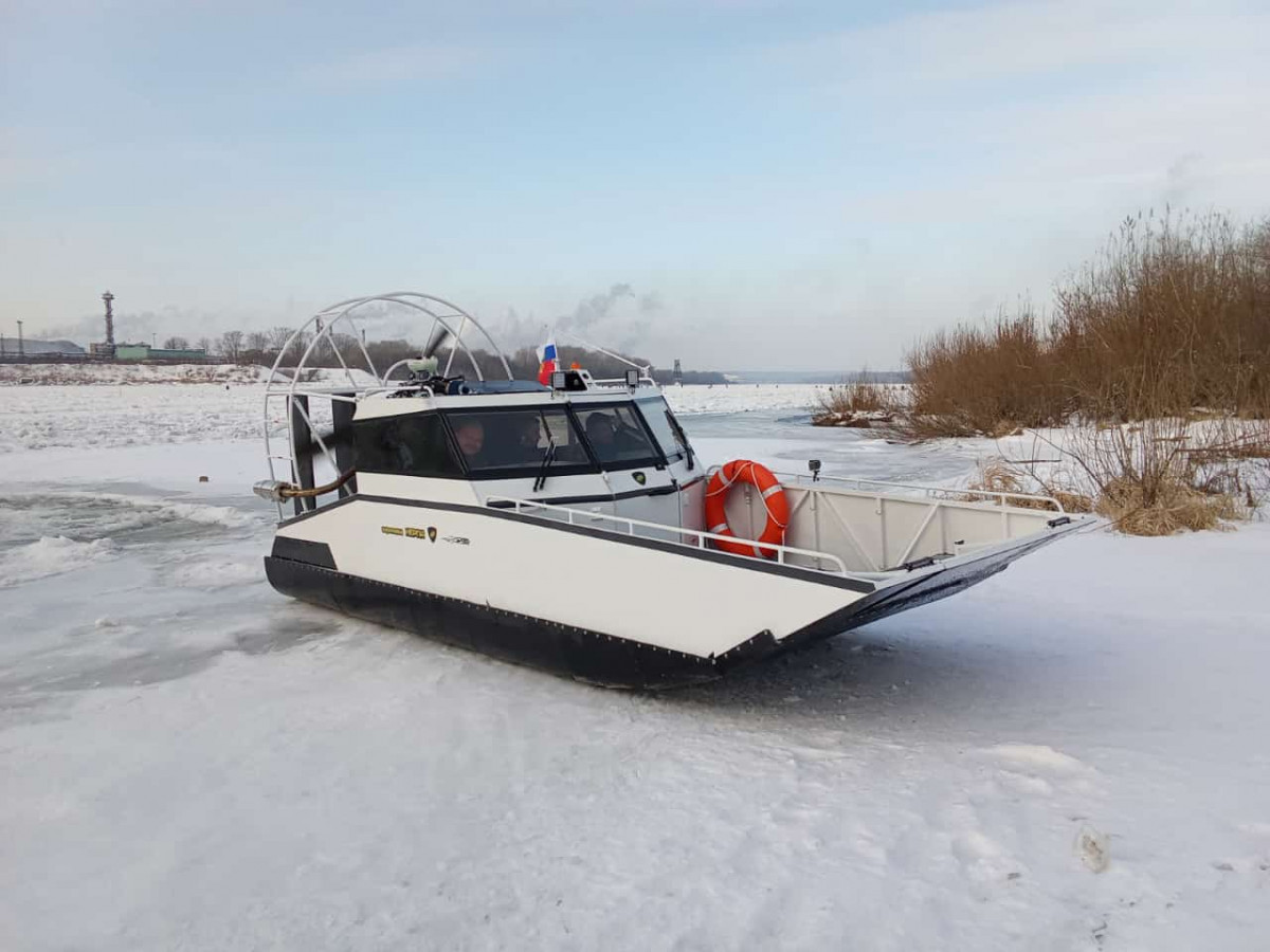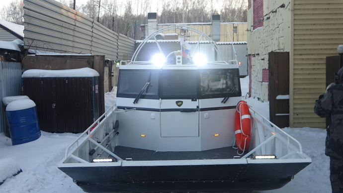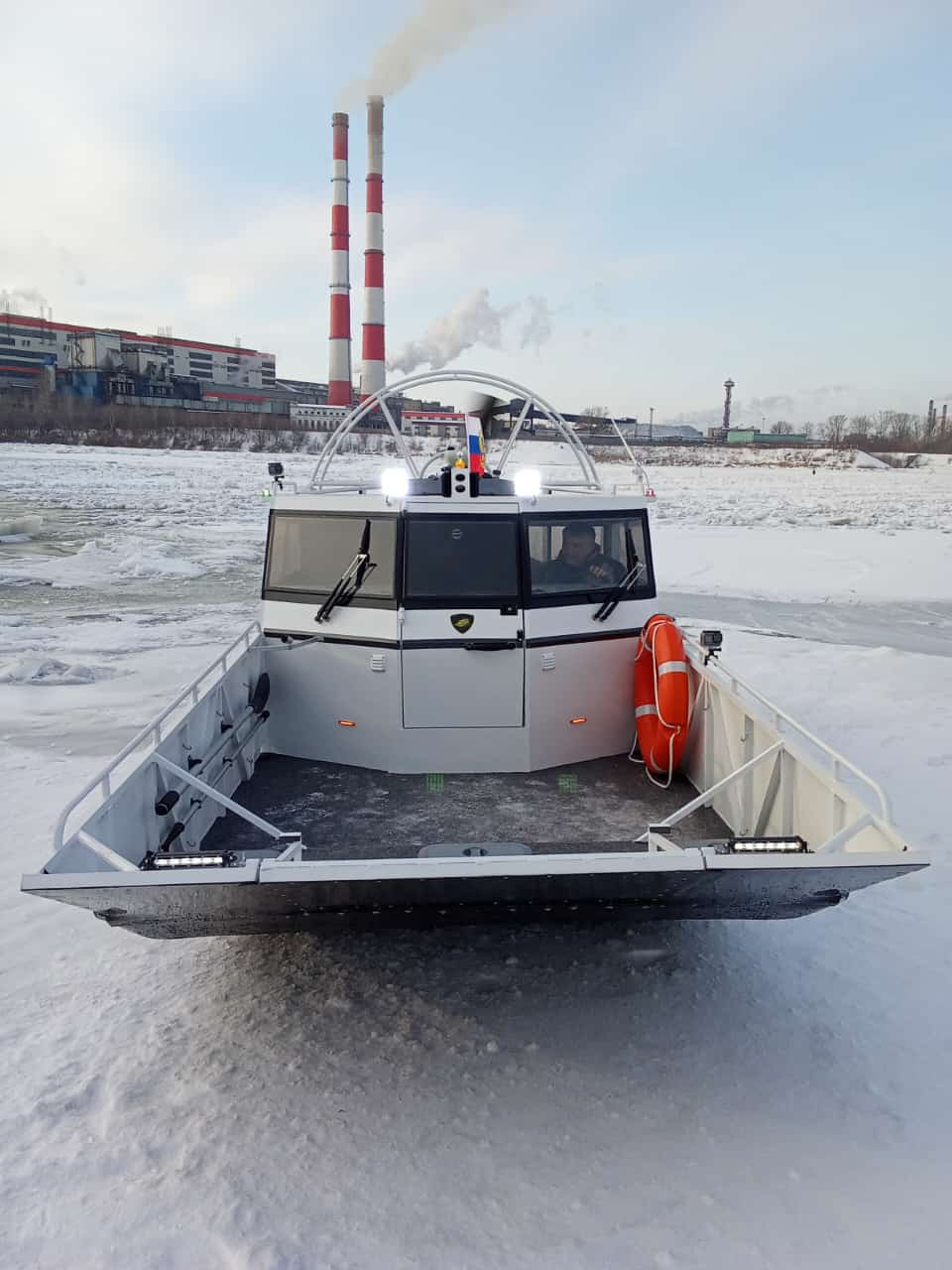 Несомненный плюс модели - аппарель в носовой части, которая может опускаться в воду и подниматься с воды, что важно для безопасной и комфортной работы водолазов. Также аппарель позволяет осуществлять загрузку техники и пострадавших непосредственно со льда.