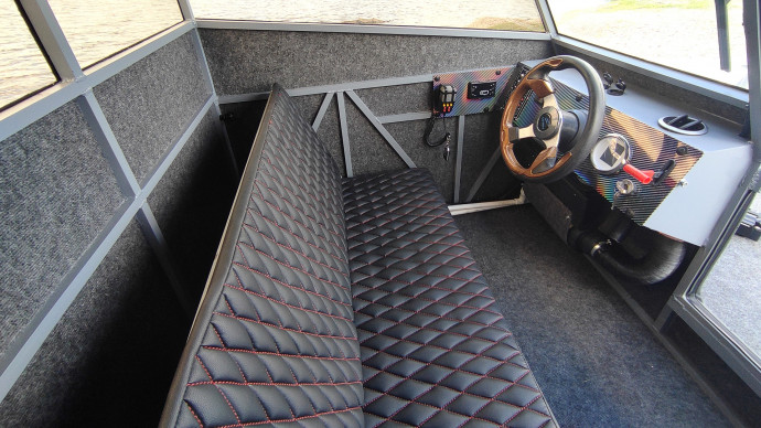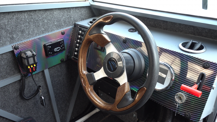 Редуктор ременный. Требует настройки и регулировки. Бензобак ёмкостью 50 л. с бензонасосом и датчиком уровня топлива. Лодка управляется рулём с приводом на воздушные рули. Оснащение рулевой консоли зависит от комплектации. В Люкс версии установлены: тахометр со счётчиком моточасов, указатели температуры двигателя, указатель скорости GPS, давления масла, вольтметр, указатель уровня топлива.