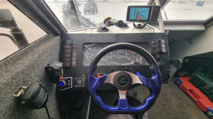 Лодка оборудована трансмиссией с запатентованным ременным V-образным редуктором для оптимального распределения нагрузки. Такое решение обеспечивает безопасность и звукоизоляцию, а также позволяет разместить двигатель внутри корпуса лодки. Он гораздо прочнее цепи, и гораздо надежней. Для создания тяги используется система из двух пропеллеров диаметром 2,5 метра. Такой внушительный размер служит для реализации большого крутящего момента. Здесь пропеллеры крутятся в одну сторону, но в середине у них есть перехлест, что дополнительно дает больший КПД тяги. Это тоже наша запатентованная разработка.
